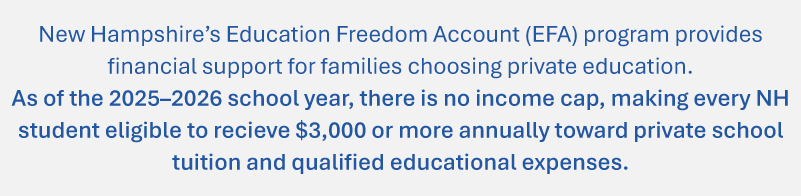 Additional funding opportunities are available through the Children’s Scholarship Fund with New Hampshire Education Freedom Accounts (EFA).