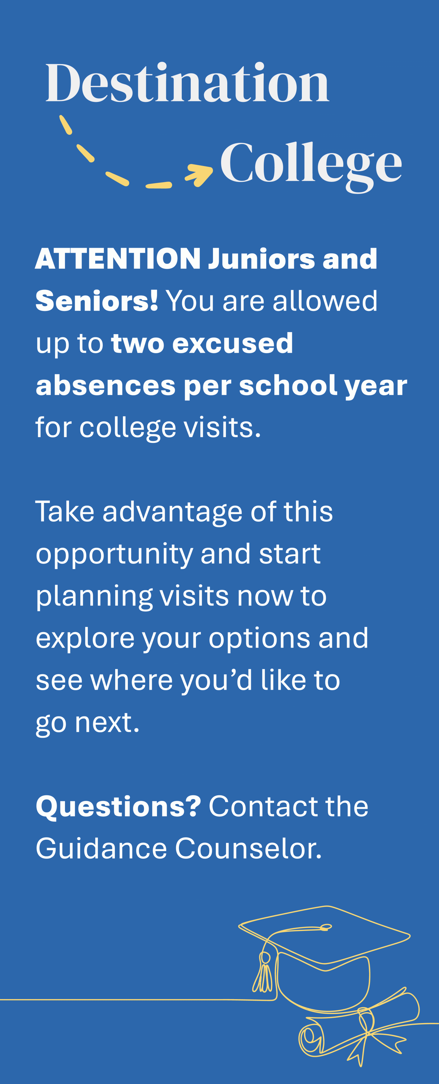 Attention Seniors: Did you know you’re allowed two excused college visit days each year? Take advantage of this great opportunity to explore your options and see where you’d like to go next! Start planning your visits now—check out colleges that interest you and schedule a time to tour the campus.