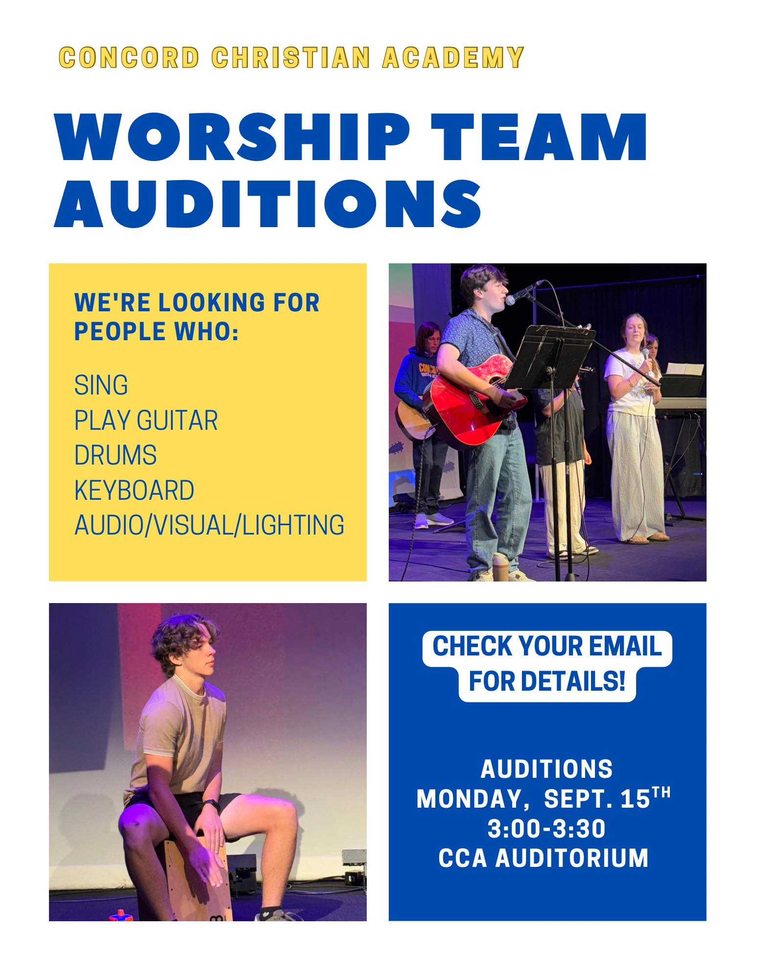 The CCA Worship Team is a talented and dedicated group of high school students and staff who lead the school community in worship during chapel each week. Through voices and instruments of all kinds, they create an atmosphere where students and staff alike are invited to turn their hearts toward Christ and engage authentically in praise and adoration.